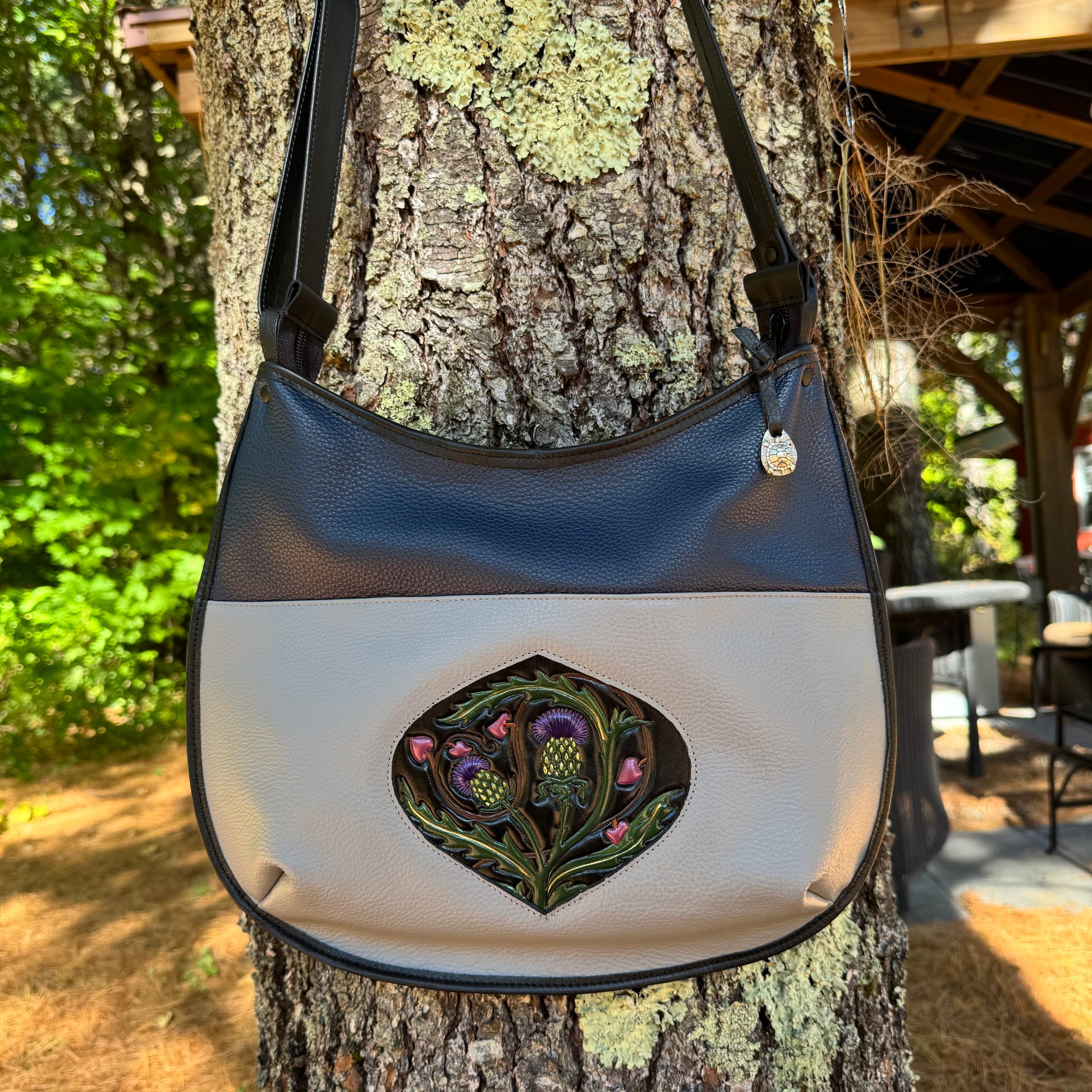 Very soft cowhide makes this our most light weight bag. Depending on the leather used the bag weighs about 10-18 oz. Color blocking beautifully matched with our classic embossed and hand painted design. Top zip closure, fully lined. Back zip pocket, inside, zip pocket. The back side is all black.