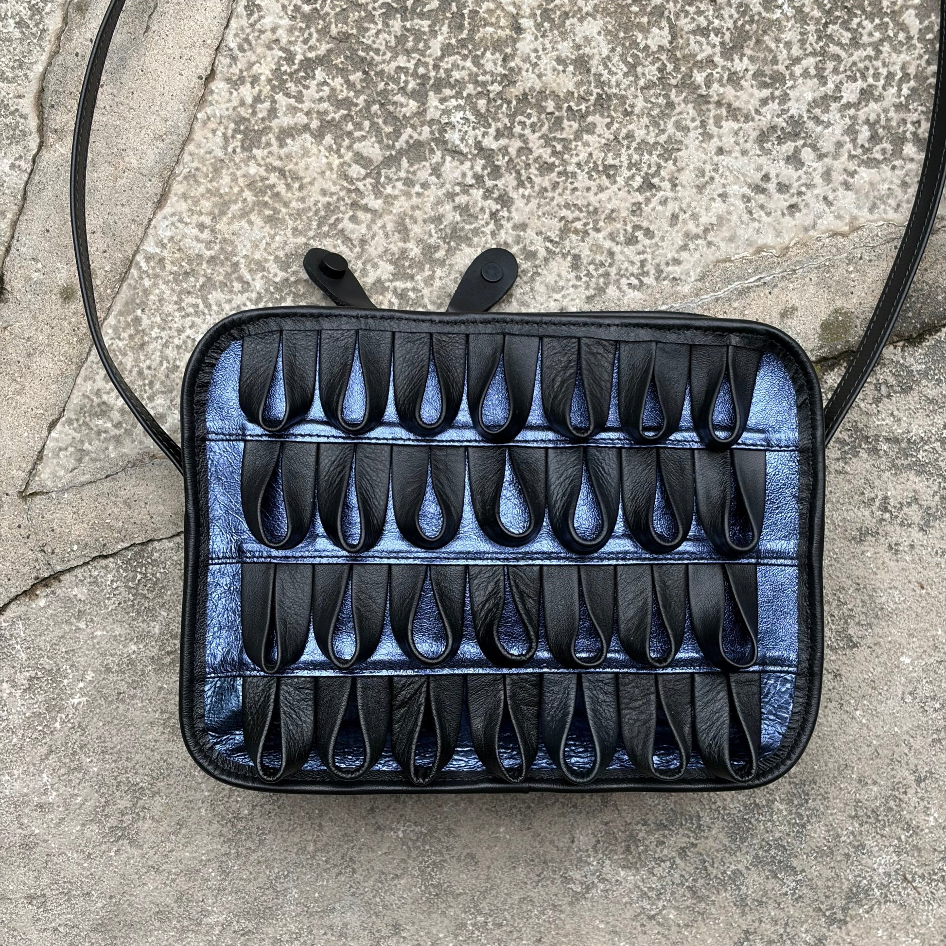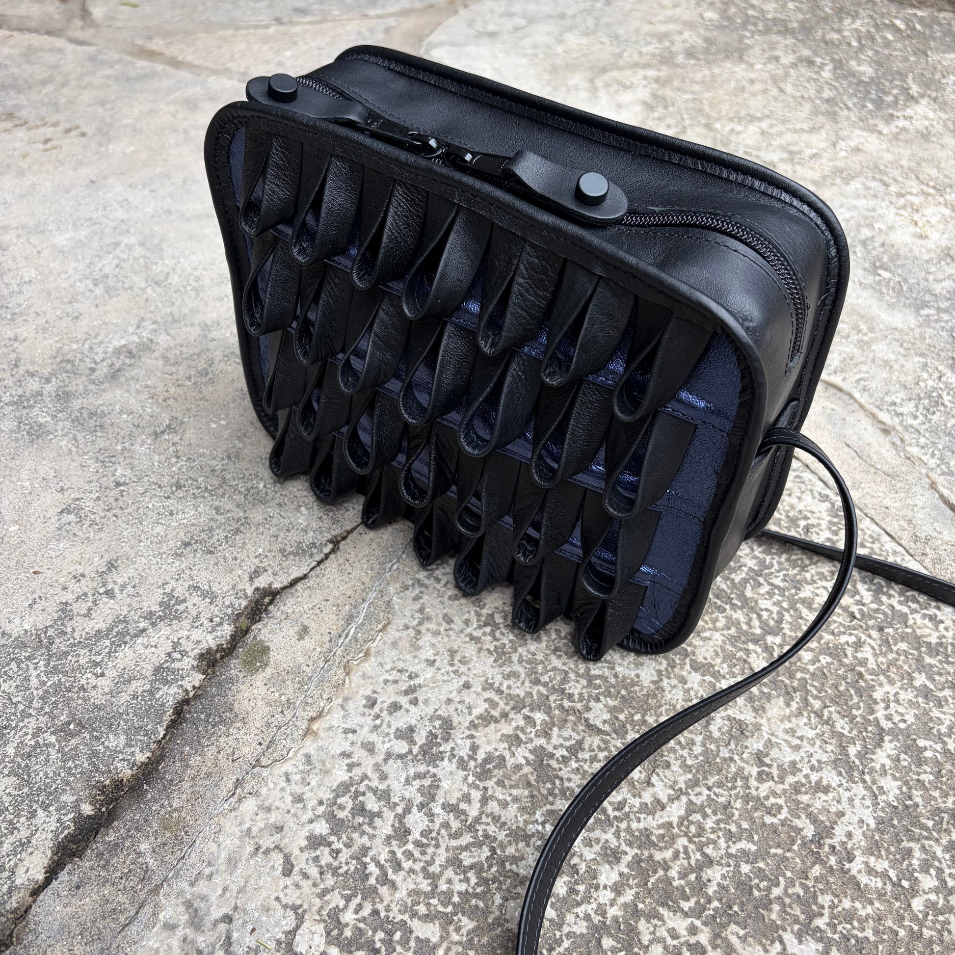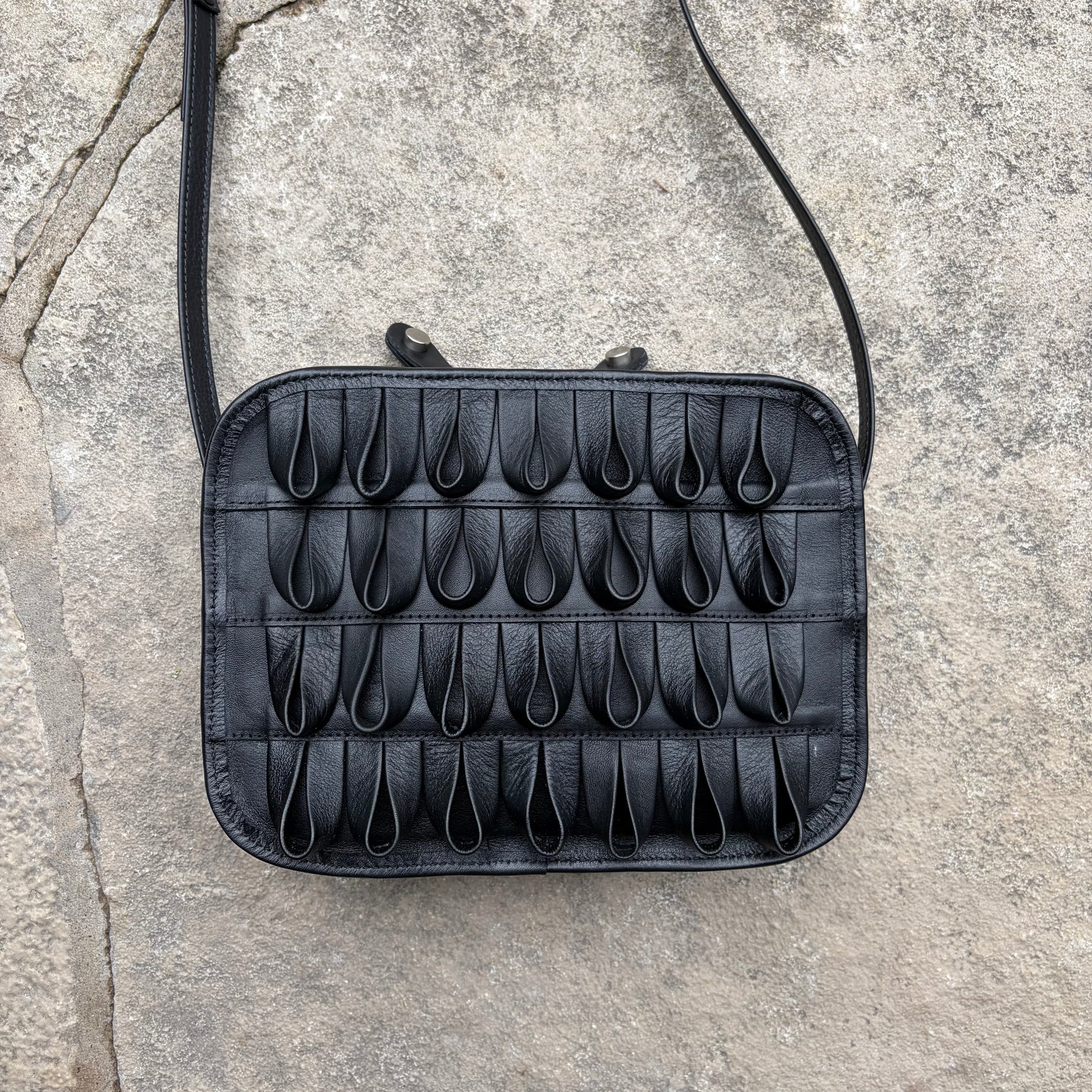 Every detail of this bag tells a story of craftsmanship. Carefully handmade from smooth black leather, each fold is thoughtfully formed to create a rich, tactile pattern you can see and feel. Each folded leather detail is individually shaped and stitched, creating a dimensional, sculptural surface that sets this piece apart. Compact yet functional, itâs designed to carry your essentials while adding a distinctive, artistic touch to your everyday style.