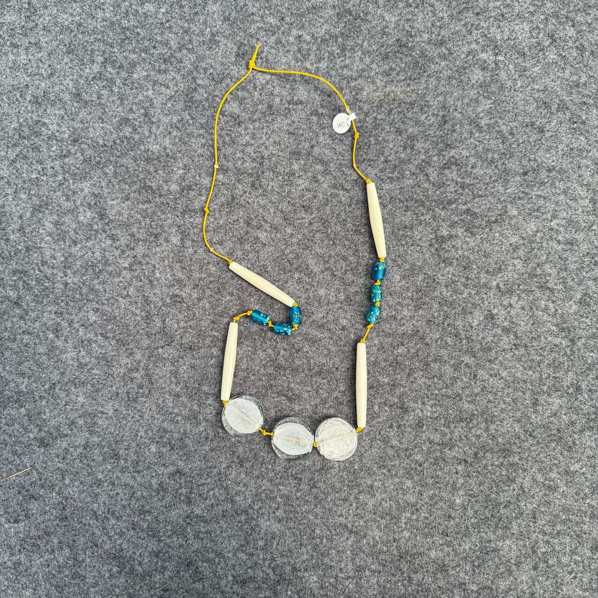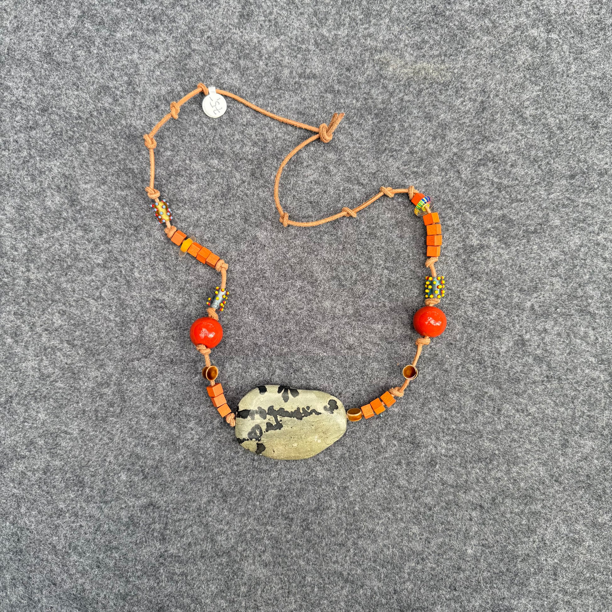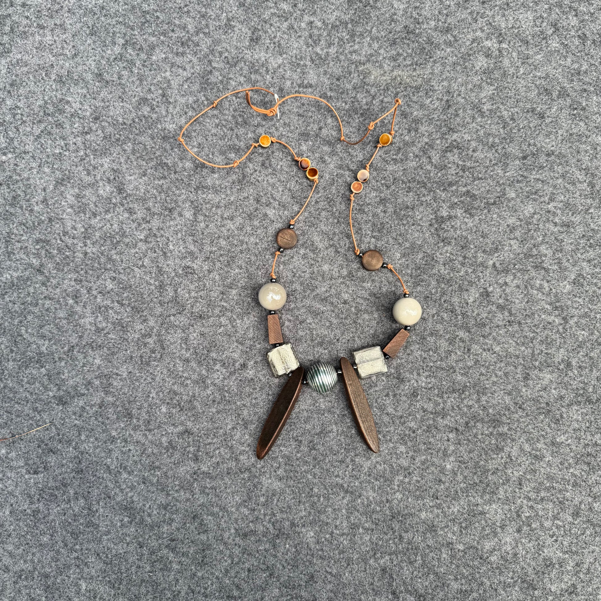 Creative necklaces made by Ausrine with various materials, including wood, leather, glass. Free style and funky.