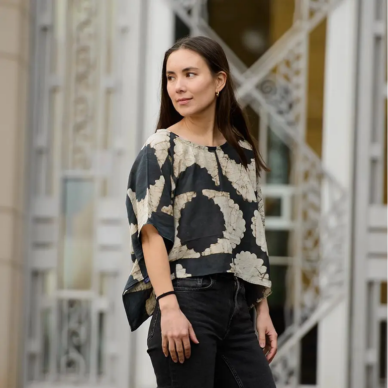 The Aruba Crop Top is the perfect addition to your wardrobe. Adding a pop of color to your outfit during hot sunny days. Inspired by Cypress Trees in the French Riviera, this block printed shirt is relax fitted and super breezy.