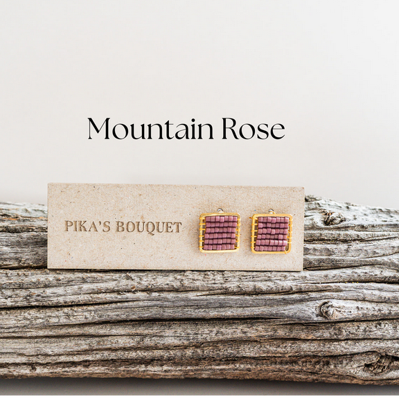 All earrings are made with brass frames and glass seedbeads. Stud earrings have stainless steel posts and hanging earrings have 14kgold hooks.